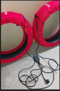 NOTE: Burnouts not covered by warranty. Leaving the power on when removed from the wheel not covered, but I maybe able to repair the burnt material, the heating wires are so good they are unlikely to have fused/burnt out. New Tire warmers have written on the bag a warning TURN OFF when removed from Wheel” and can hang this on the bike to warn pit crew.